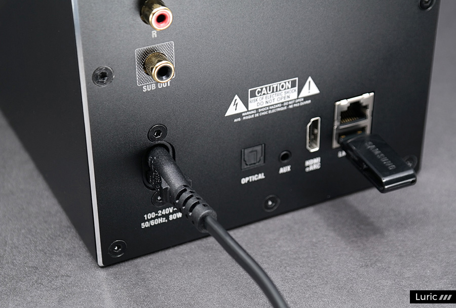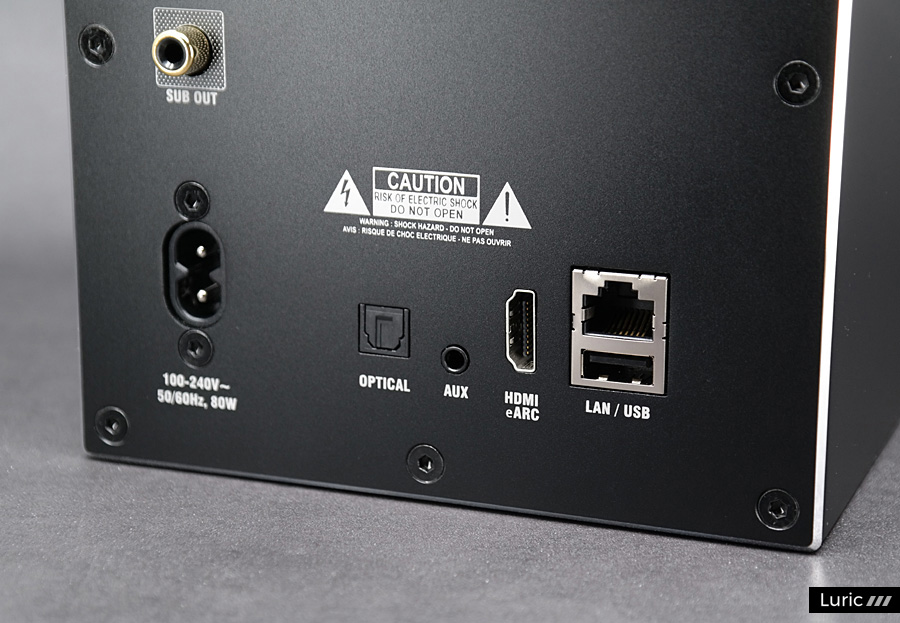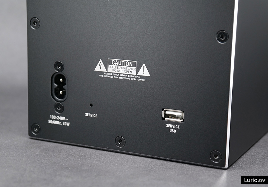 서브 스피커(Secondary)는 후면 포트가 훨씬 단순합니다. USB-A 포트가 하나 있는데 이것은 제품 점검할 때 쓰는 것이므로 유저가 손댈 일은 없습니다. 혹시 서브 스피커에 문제가 있다면 서비스(Service)라고 적힌 아주 작은 구멍에 핀으로 찔러서 누르는 스위치가 있으니 꾹 찔러줍시다. 이렇게 좌우 스피커의 리셋을 모두 완료할 수 있습니다.