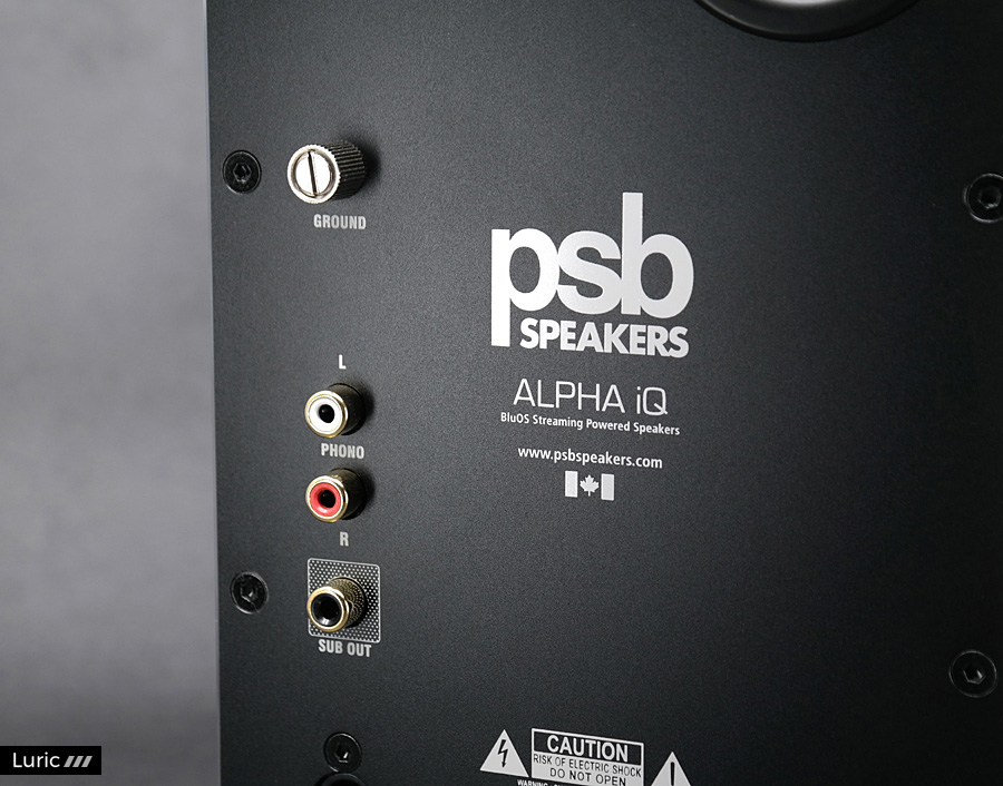 메인 스피커 후면의 왼쪽 상단에는 턴테이블 연결할 때 사용하는 그라운드 커넥터와 MM 포노 전용의 RCA 커넥터 한 쌍이 있습니다. 그 아래쪽에는 알파 iQ의 저음 보강이 필요할 때 연결하는 외부 서브 우퍼의 커넥터가 있군요. 혹시 알파 iQ로 영화를 주로 감상하게 된다면 서브 우퍼를 추가하는 것도 좋겠습니다.