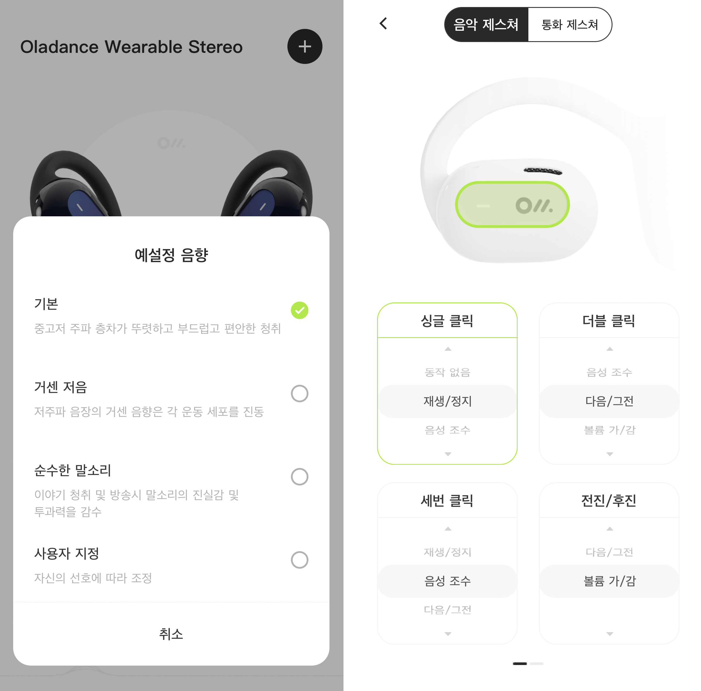 Oladance 앱의 기능 설명은 한국어 번역이 조금 어색하지만 어떤 뜻인지 이해할 수는 있습니다. (-_-);; 그 중에서 제품 용도에 필수적인 EQ 설정이 있는데, '거센 저음'과 '순수한 말 소리'가 되겠습니다. Oladance Wearable Stereo는 원래 저음이 강한 편이지만 더 빵빵한 저음을 원한다면 거센 저음을 선택해봅시다. 제품을 대부분 음성 통화에 사용하거나 팟캐스트를 주로 듣는다면 순수한 말 소리를 선택해서 사람 목소리를 선명하게 만들 수 있습니다.