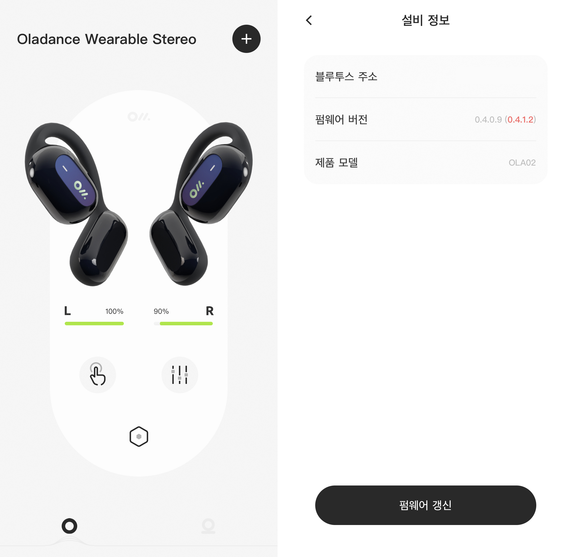 이 앱에서는 펌웨어 업데이트, EQ 설정, 터치 패드 입력 개인화 등의 여러 기능을 쓸 수 있습니다. 단, 앱을 사용하려면 로그인이 필요해서 휴대폰 번호나 이메일 주소 중 하나를 써야 합니다. 제 생각에는 이메일이 더 편리한데요. 이메일로 발송되는 인증 번호 네 자리만 입력하면 바로 로그인됩니다. 제가 받은 Oladance Wearable Stereo는 구 버전이라서 앱을 통해 0.4.1.2 버전으로 펌웨어 업데이트를 했습니다. 소리 변경은 없는 듯하고, 원래는 짧은 음성 안내만 있었는데 이제는 터치 패드 입력과 각종 동작 안내에서 부드러운 신호음이 들리게 됐습니다.