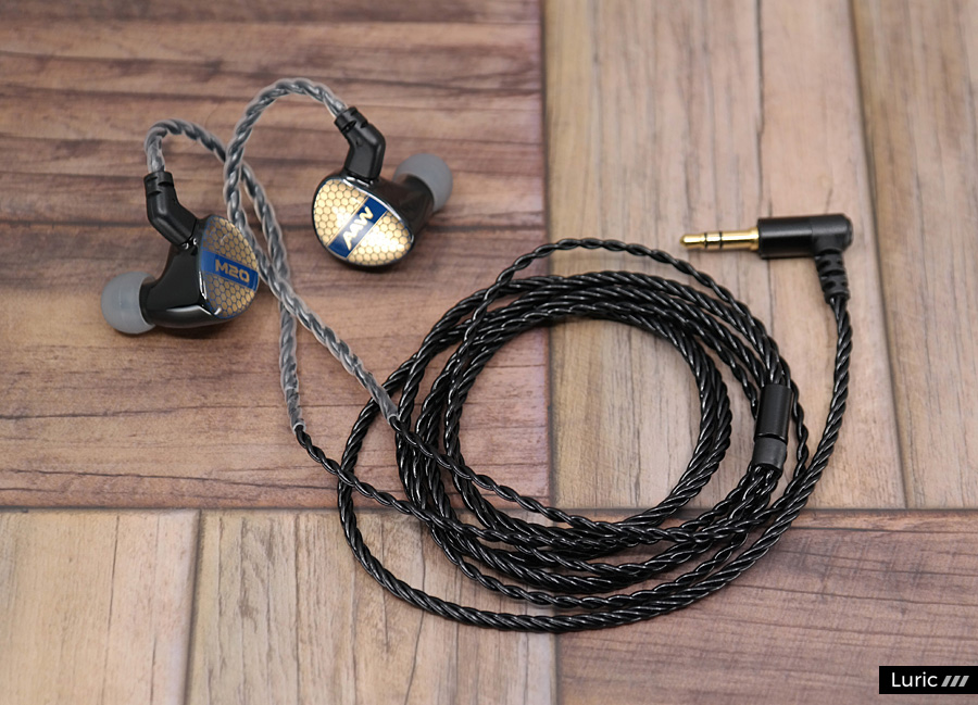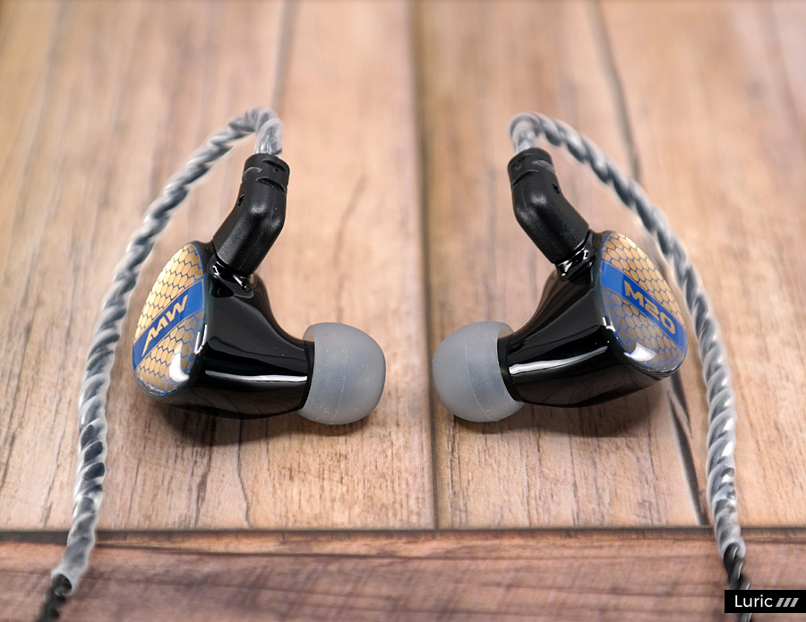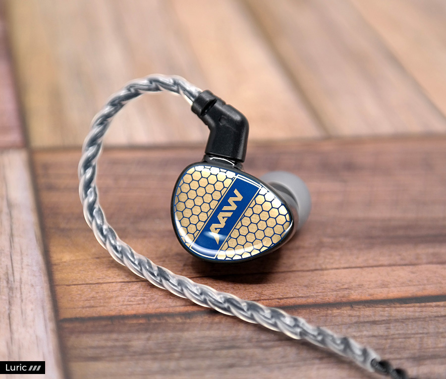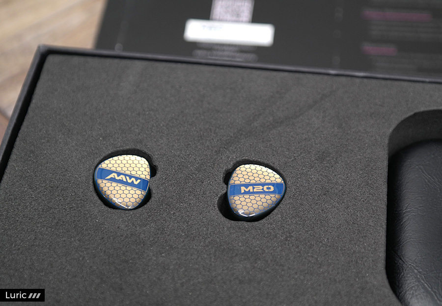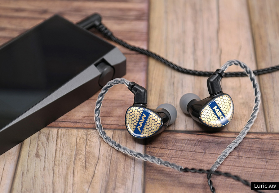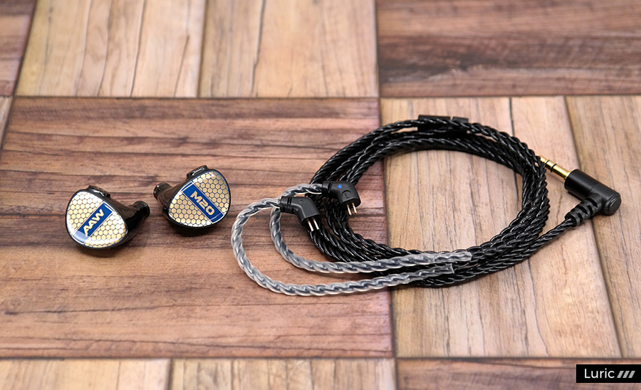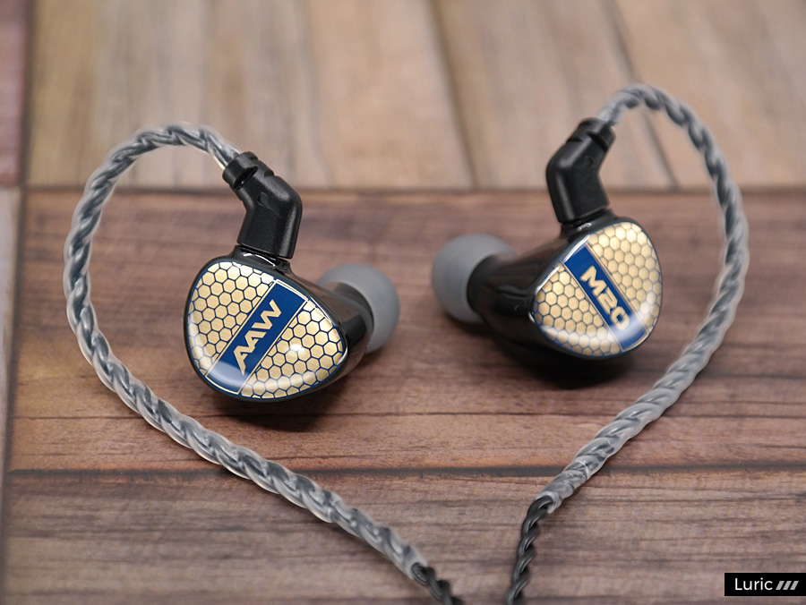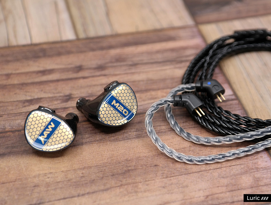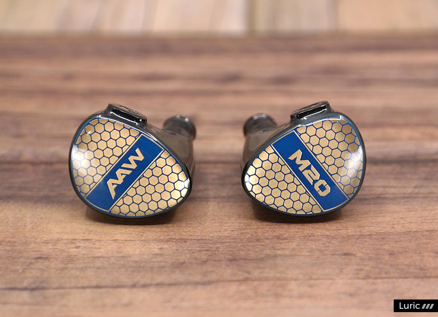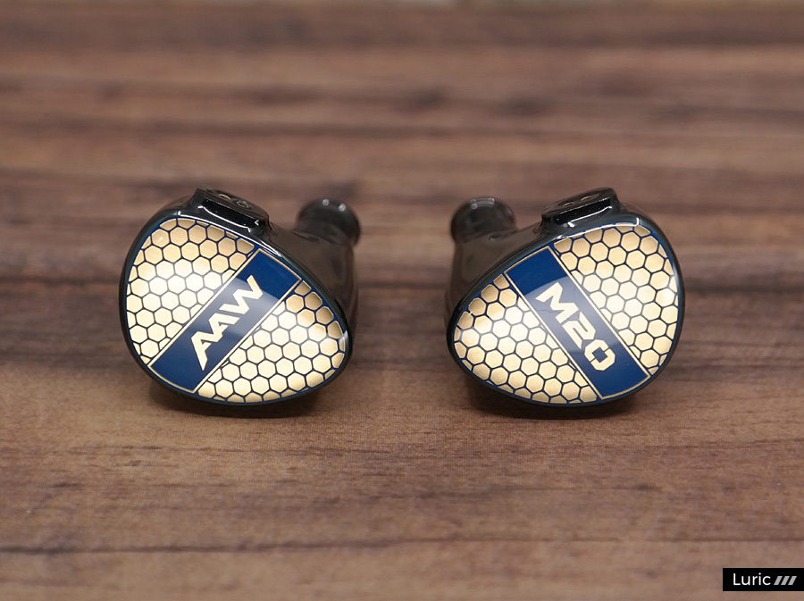 M20는 1 BA로 고음과 중음을 재생하고 1 BA 우퍼로 저음을 재생합니다. 2-Way 크로스오버, 2 보어 구조이며 노즐 끝부분에는 귀지 유입을 막는 철망이 있습니다. 제가 여태껏 사용해본 AAW 이어폰들보다도 노즐이 긴 편이라서 귀에 단단히 끼울 수 있으며 소음 차단 효과도 좋습니다. 페이스 플레이트 디자인은 조금 특이한데요. 파랑색의 벌집 패턴 속에 금색을 입혀놓았습니다. 나중에 제품 설명을 보니 금 도금이라고 합니다. 그래서 빛이 반사되는 각도에 따라서 페이스 플레이트의 색이 많이 달라집니다.