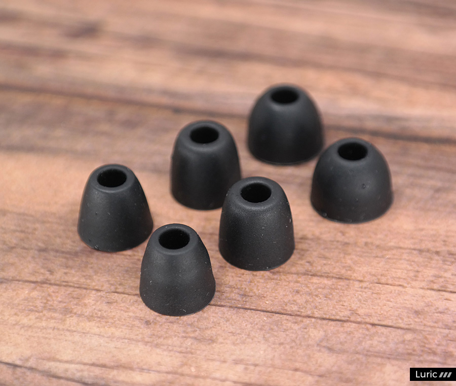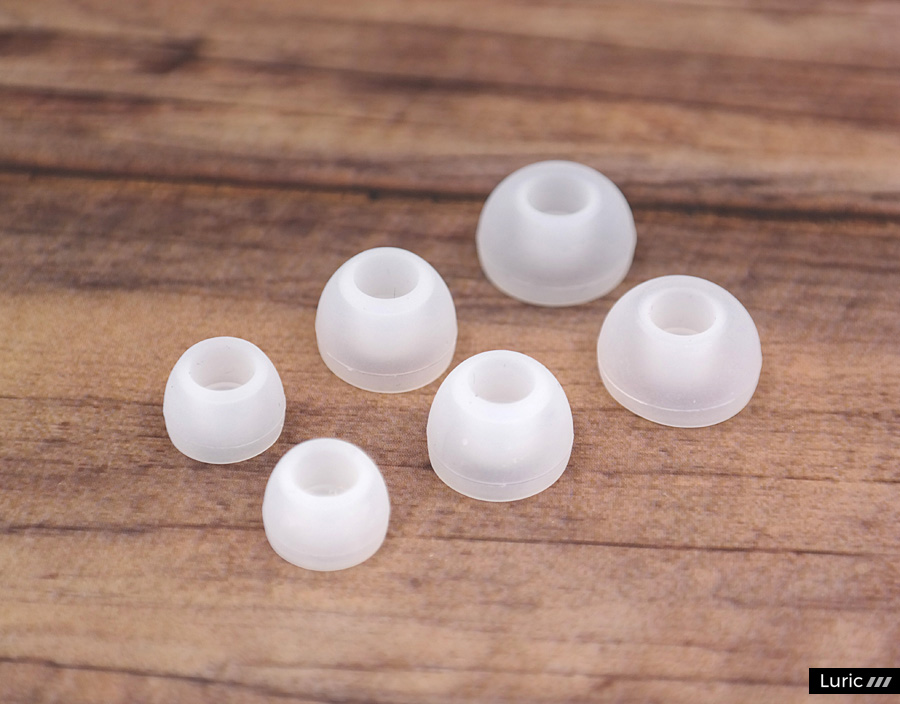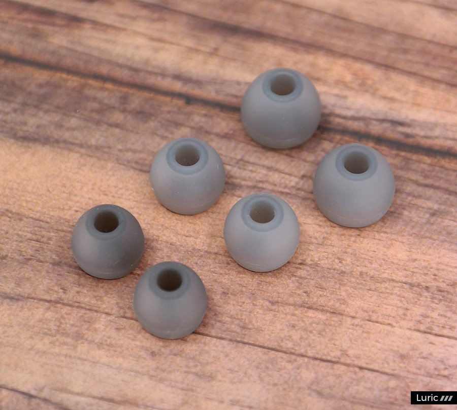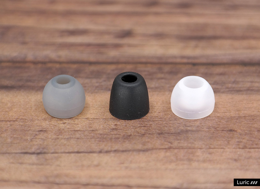 M20의 이어팁은 세 가지 종류이며 각각 다른 소리를 내기 때문에 모두 사용해보시길 권하겠습니다. 회색의 살짝 두꺼운 실리콘 이어팁은 기본형이며, 검정색의 길쭉한 실리콘 이어팁은 고음형이고, 흰색의 널찍한 실리콘 이어팁은 저음형입니다.