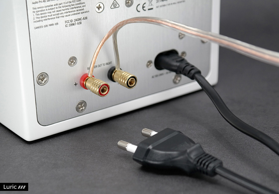 박스 속에서 나오는 기본 구성품은 세 가지입니다. 왼쪽 스피커에 연결하는 8자 플러그의 전원 케이블, 좌우 스피커를 연결하는 스피커 케이블, 여러모로 편리하며 보기에도 좋은 리모컨입니다. A28은 Wi-Fi와 블루투스의 무선 입력이 있으나 기본적으로는 좌우 채널을 유선 연결하는 액티브 북쉘프 스피커에 속합니다. 왼쪽 스피커가 앰프와 입력단을 모두 지닌 메인 스피커이고, 오른쪽 스피커는 스피커 케이블만 연결하는 서브 스피커입니다. 전원 케이블은 8자 플러그라서 자체 접지를 할 수 없고 교체도 어렵지만 스피커 케이블은 쉽게 업그레이드할 수 있겠습니다. (접지는 다른 오디오 기기의 유선 입력 연결로 하면 됨) 저는 일반적 유저의 기준에서 제품을 다루므로 기본 케이블을 사용했습니다.
