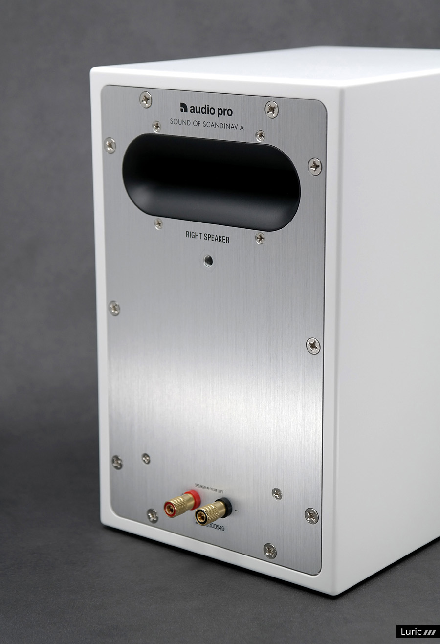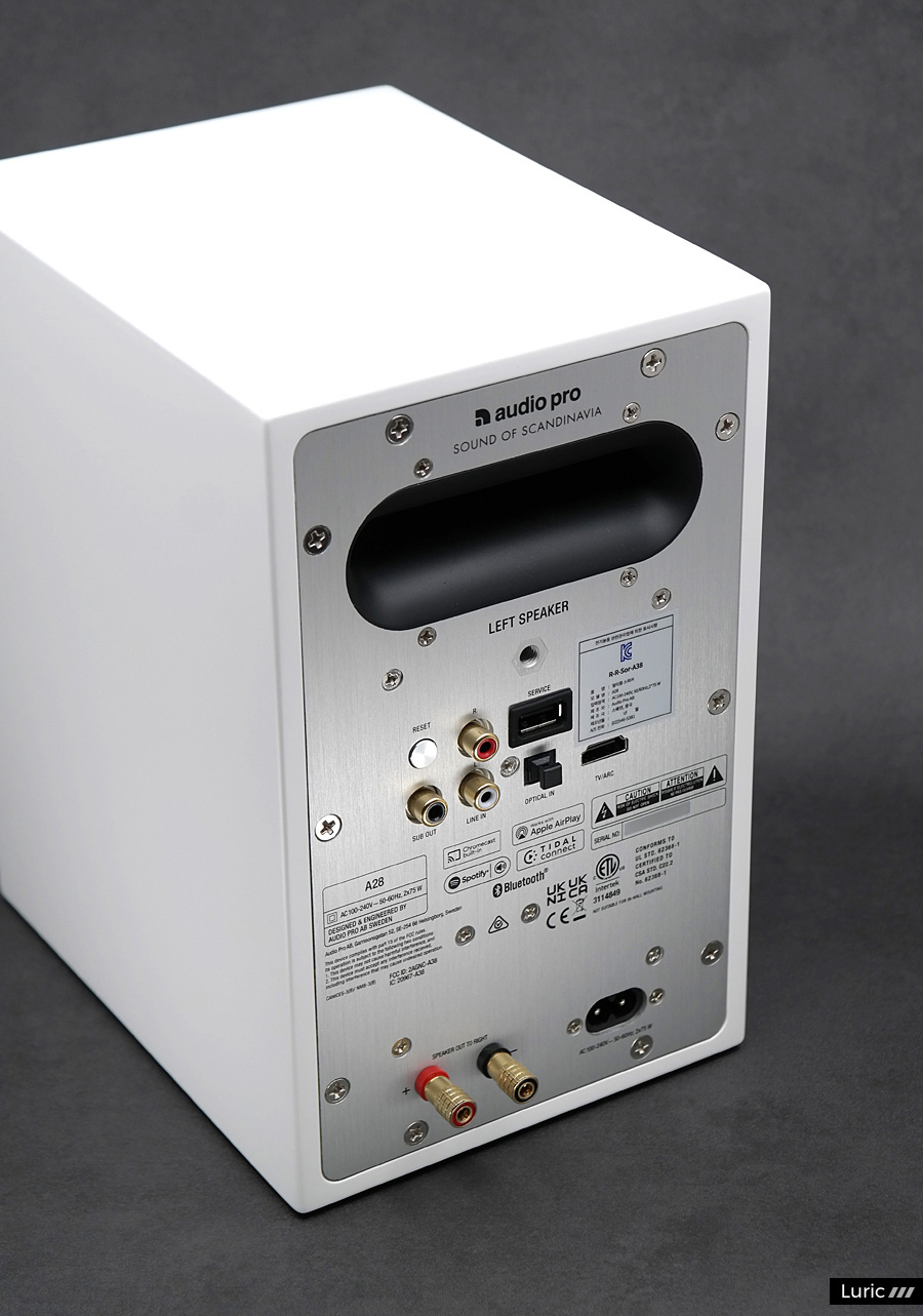 제품 후면을 더 살펴봅시다. 알루미늄으로 보이는 금속 패널로 마감되어 있으며 상단에 베이스 포트가 있습니다. 왼쪽 스피커의 입력 구성은 Wi-Fi 2.4GHz / 5GHz, 블루투스 4.2 버전, RCA 라인 입력, Toslink 옵티컬 입력, HDMI ARC가 있으며 외장 서브 우퍼 연결도 가능합니다. RCA 커넥터들의 옆에 있는 USB-A 포트는 제품 점검할 때 쓰는 것이라서 유저가 건드릴 필요는 없습니다.
